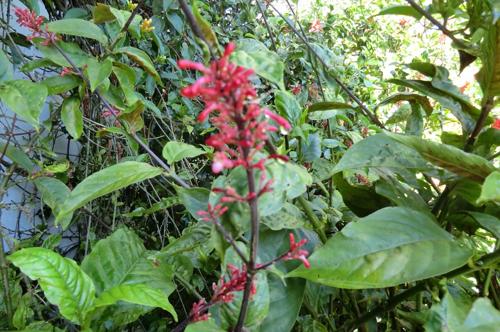 Odontonema strictum (Firespike)- A tropical looking, evergreen, upright growing shrub with glossy green leaves and bright red flowers. Long flowering period from early summer to late autumn in frost free areas. Will grow in full sun or part shade. In frosty areas treat as a herbaceous perennial. Food source for birds and butterflies.