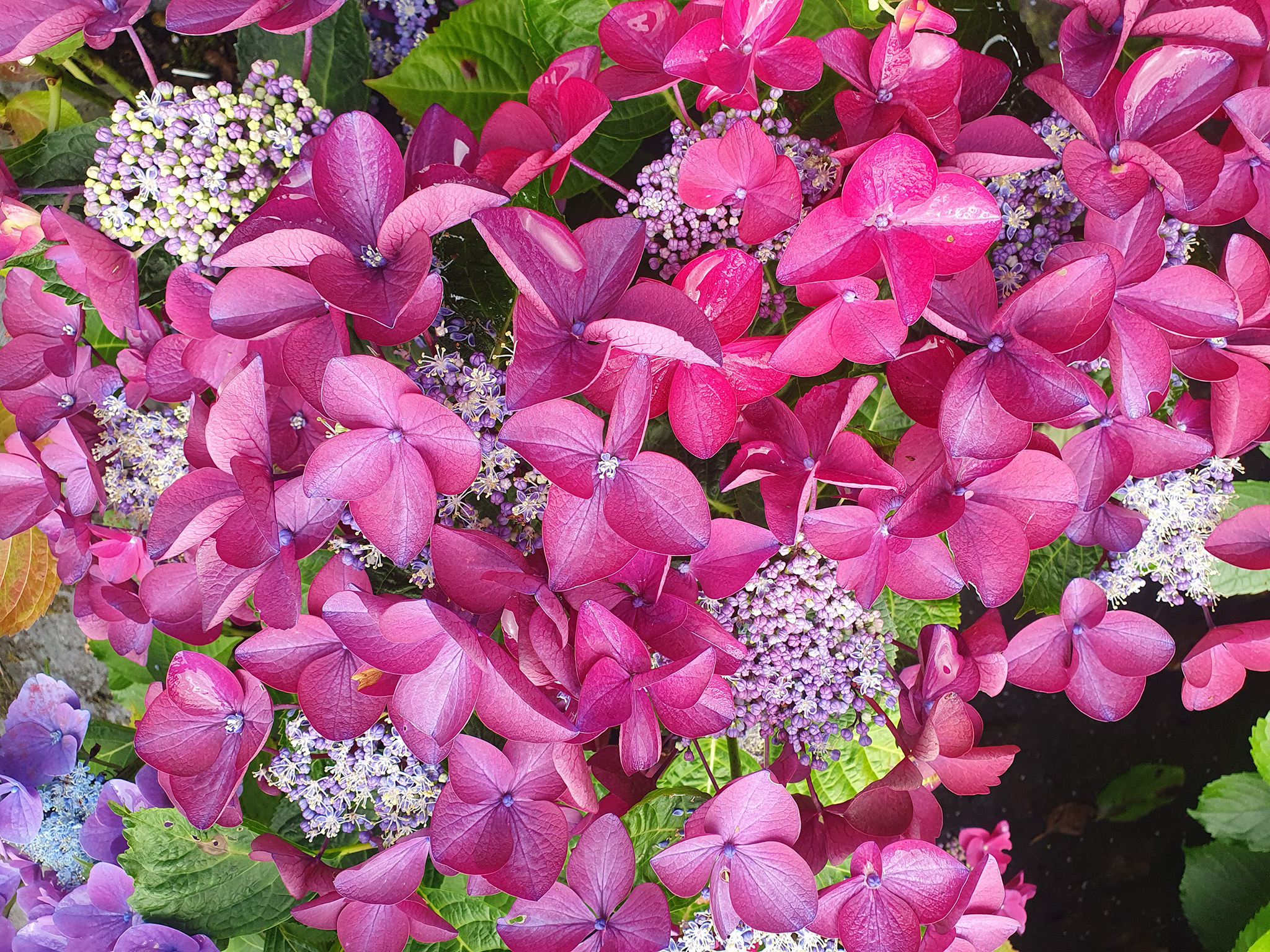 Frilly, starry florets, often bearing three different coloured heads at one time. Rosy pink, rich magenta to light sea-blue. Quite stunning as it changes colours in autumn to antique rose and purple. Good for cut flower and drying. Needs a shady situation.